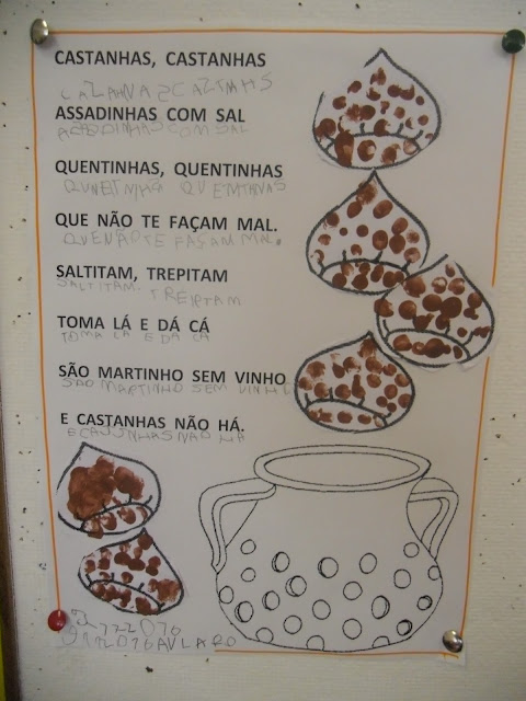 Depois pintámos meia dúzia de castanhas com o carimbo dos nossos dedos (e trabalhámos o conceito de meia dúzia)...