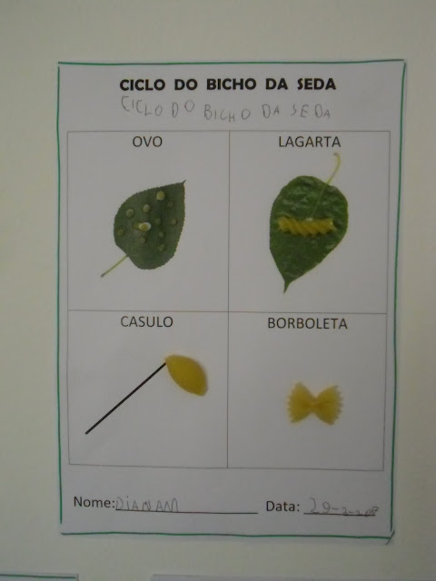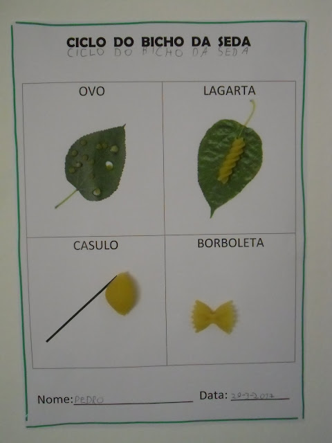 Hoje fizemos a sequência do ciclo/fases do bicho da seda com massas alimentares.