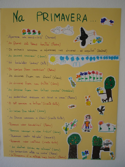 e em grande grupo conversámos sobre esta estação do ano. Vimos as principais características da primavera e registámos tudo numa cartolina (como já tínhamos feito com o outono e o inverno, lembram-se?)...