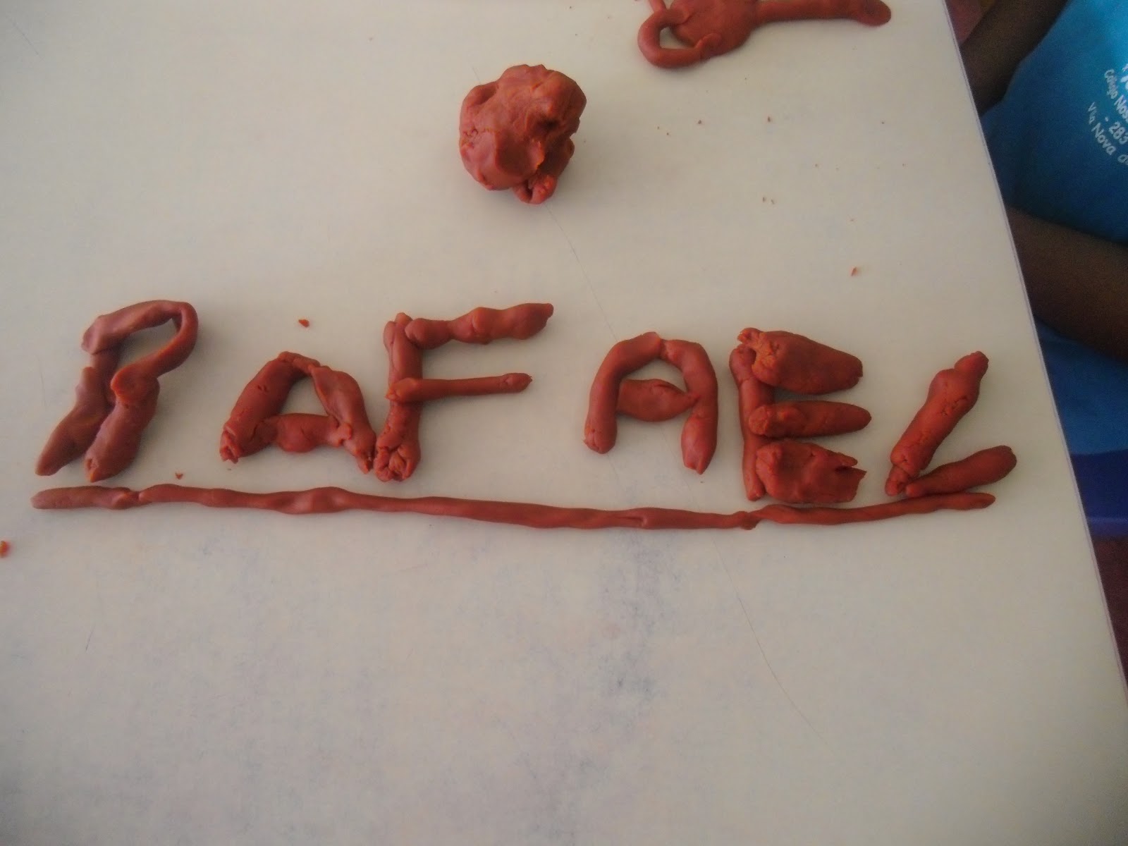 Por fim, colámos o nosso nome no cartão! A Susana cortou as letrinhas do nome e tivemos de colocar tudo por ordem... Vejam só...