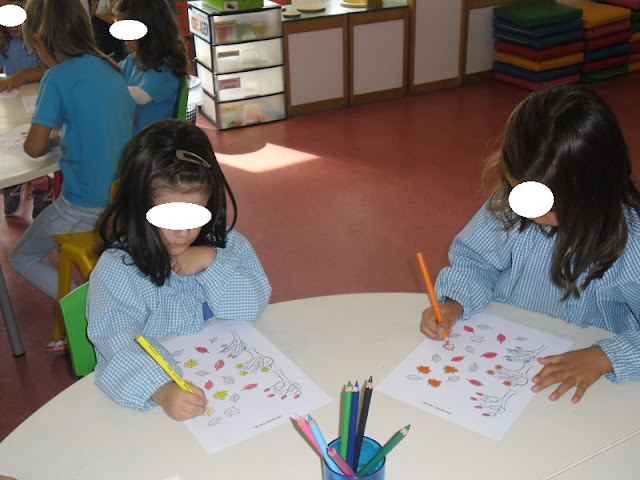 Para trabalhar/desenvolver o conceito de LEGENDA pintámos algumas folhas de outono. A Susana deu-nos três árvores com folhas diferentes. Pintámos cada árvore com cores diferentes (cores de outono, claro!) e depois encontrámos algumas folhas iguais para pintar da mesma cor...