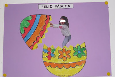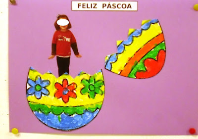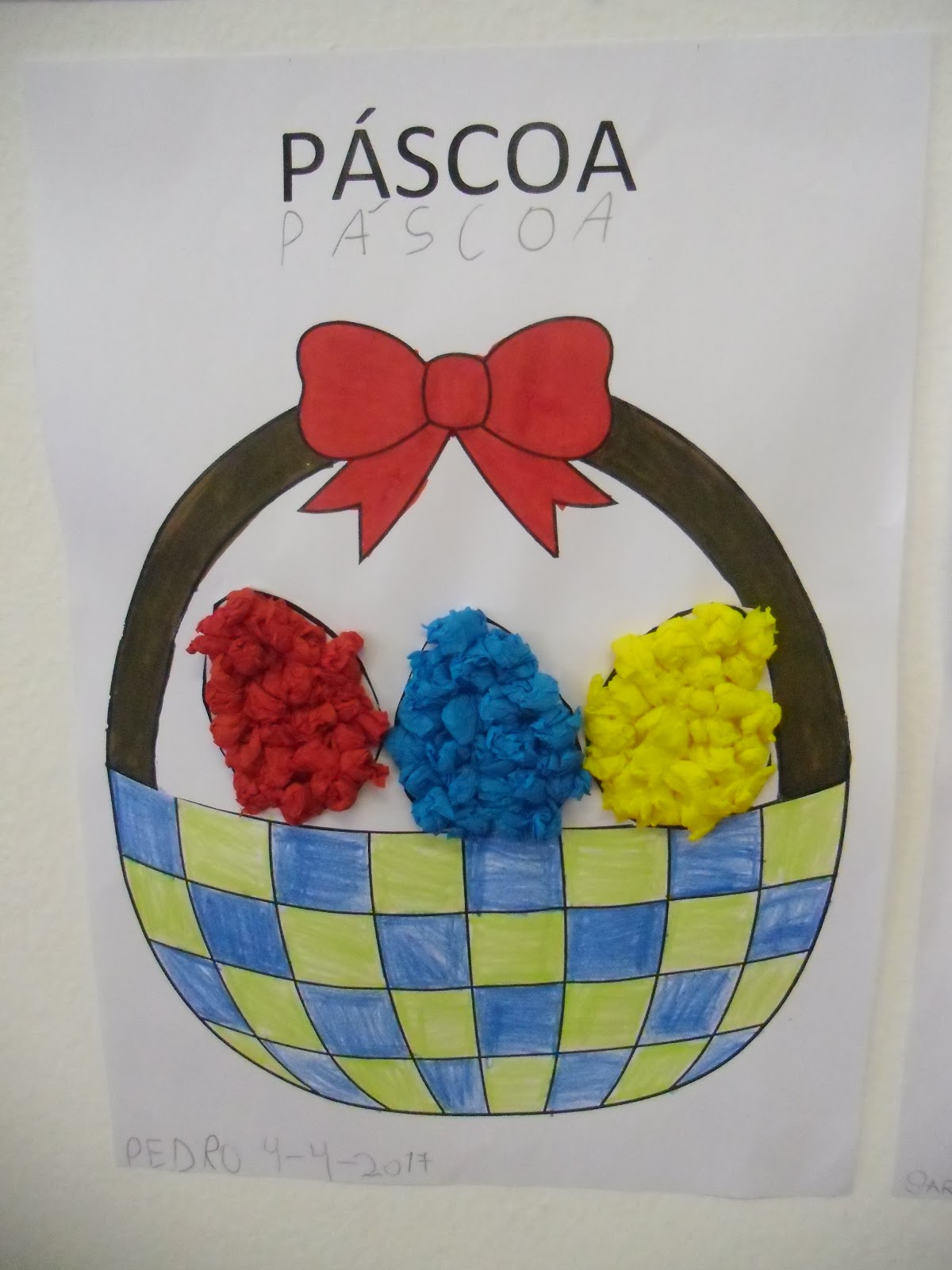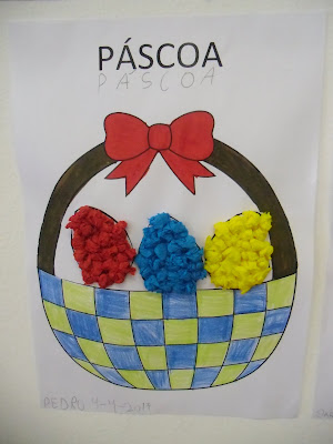 De seguida, com papel crepe decorámos três ovinhos da Páscoa: um azul, outra amarelo e outro vermelho. Tivemos de enrolar os papelinhos e fazer uma bolinha (motricidade fina(destreza manual), depois recortámos os ovos e colámos dentro no nosso cestinho.