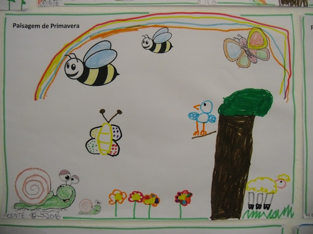 Depois de explorar as características da primavera escolhemos dois animais desta época: a abelha e a joanhinha. Cada criança escolheu um destes animais e depois pintou com tinta de amarelo a abelha e de vermelho a joaninha!