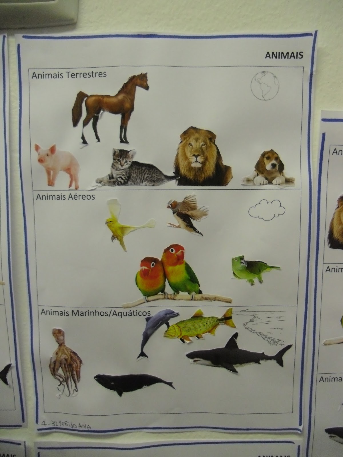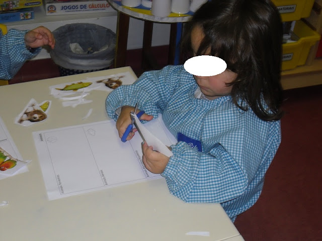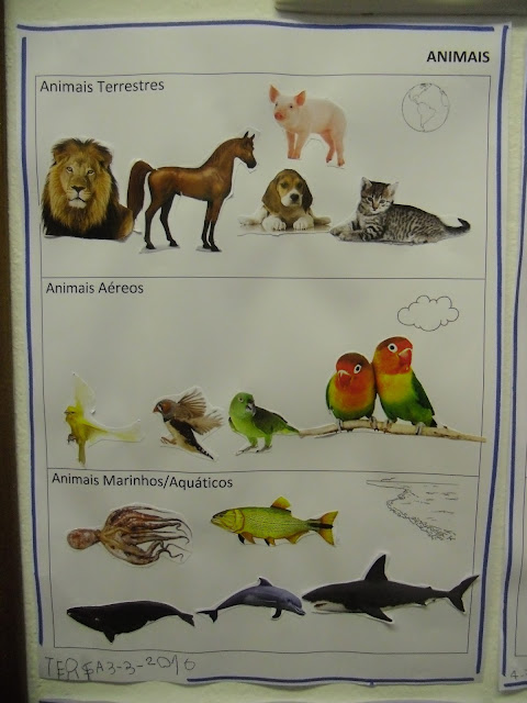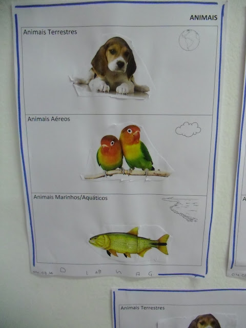Então a Susana deu-nos uma folha com muitos animais (terrrestres, marinhos/aquáticos e aéreos), depois recortámos com muito cuidadinho e colámos noutra folha que tinha como simbolos.... o planeta terra (onde teriamos de colar os animais terrestres), uma nuvem (onde colámos os animais aéreos) e o mar (para colar os animais marinhos) - importante decifrar códigos/pistas/ler imagens-. Será que conseguimos colar os animais no lugar correspondente??!!